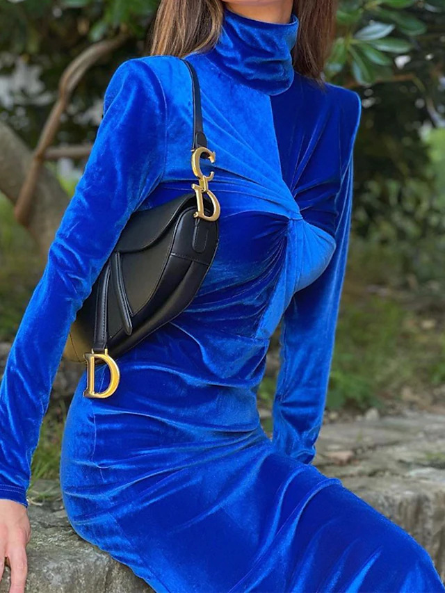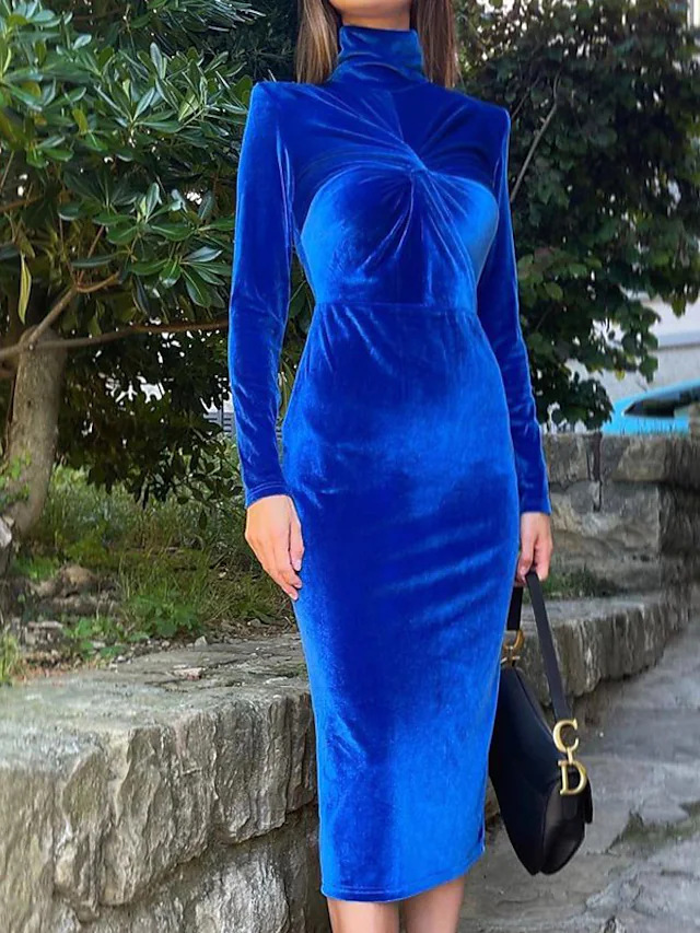 Solid Blue Dress With High Collar And Pleats